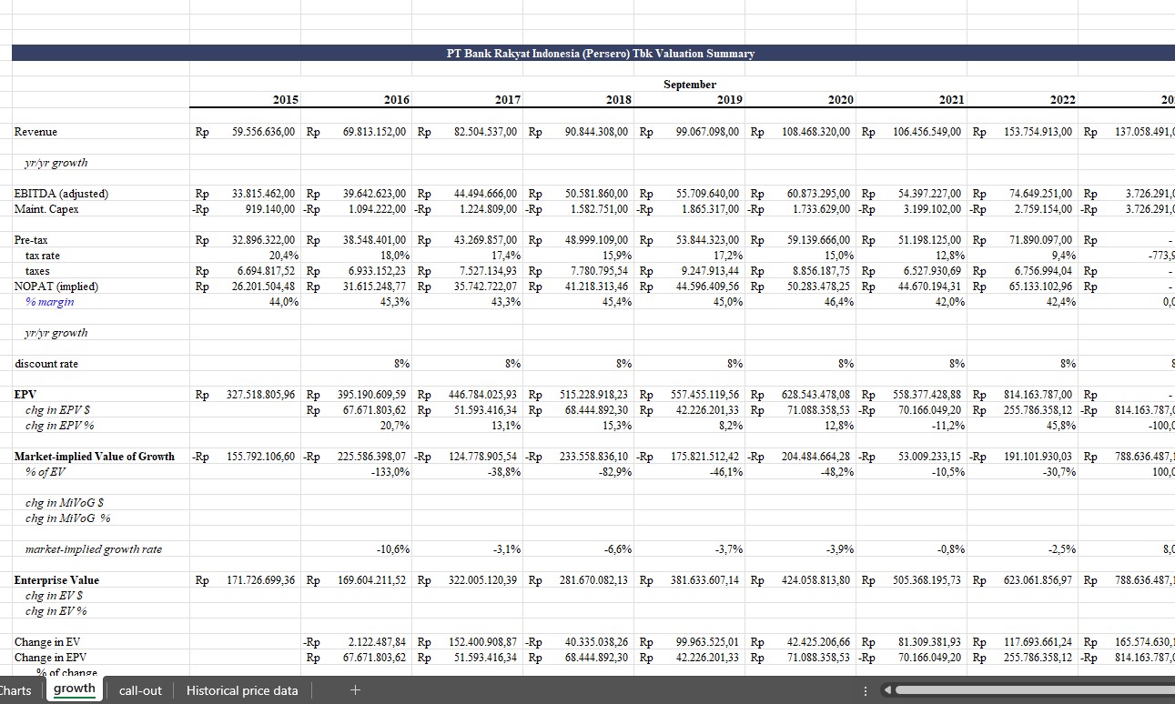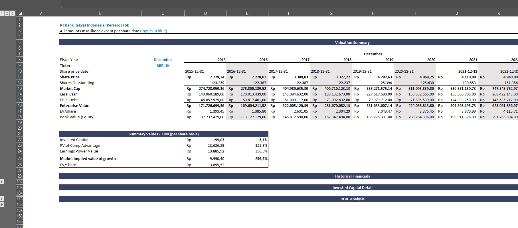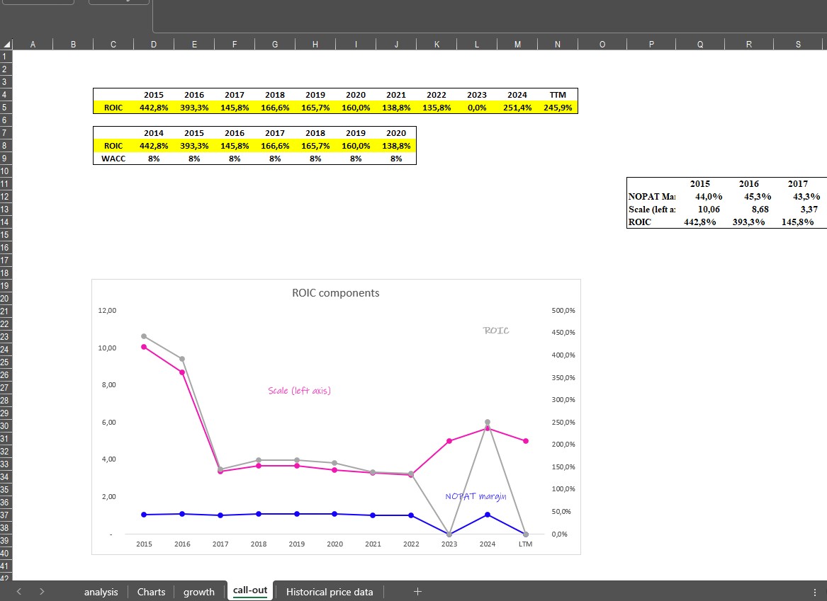 Analysis, Historical Financial chart, Invested Capital Detail, Chart (Earning Power Value, NOPAT Growth, Enterprive Value), call-out, growth, historical valuation, ROIC Analysis